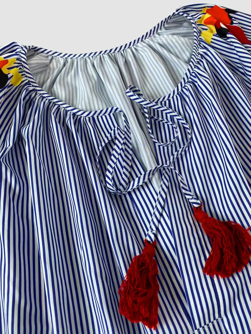 This elegant women's maxi dress features a flattering V-neckline and stylish puffed sleeves, enhanced by a timeless blue stripe print. The adjustable waist tie belt allows for a customized fit, while the long flowing hem adds graceful movement. Button closure ensures easy wear, and the non-stretch fabric maintains a structured silhouette. Suitable for casual outings, beach vacations, and semi-formal occasions, this all-season dress is also machine washable for effortless care. A versatile and refined addition to any wardrobe.
